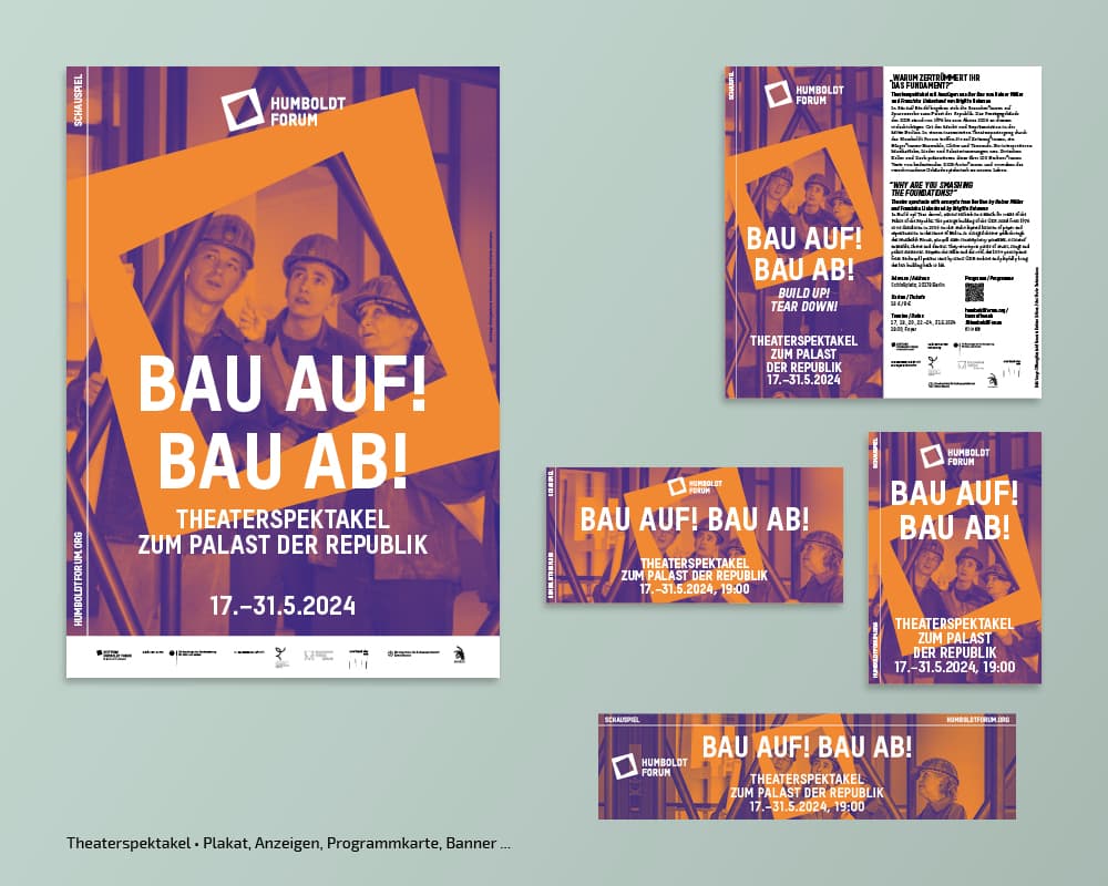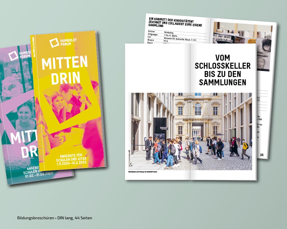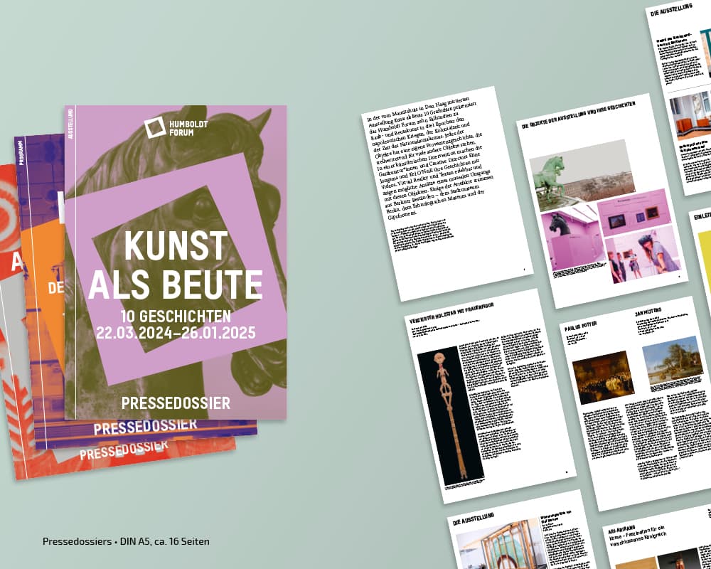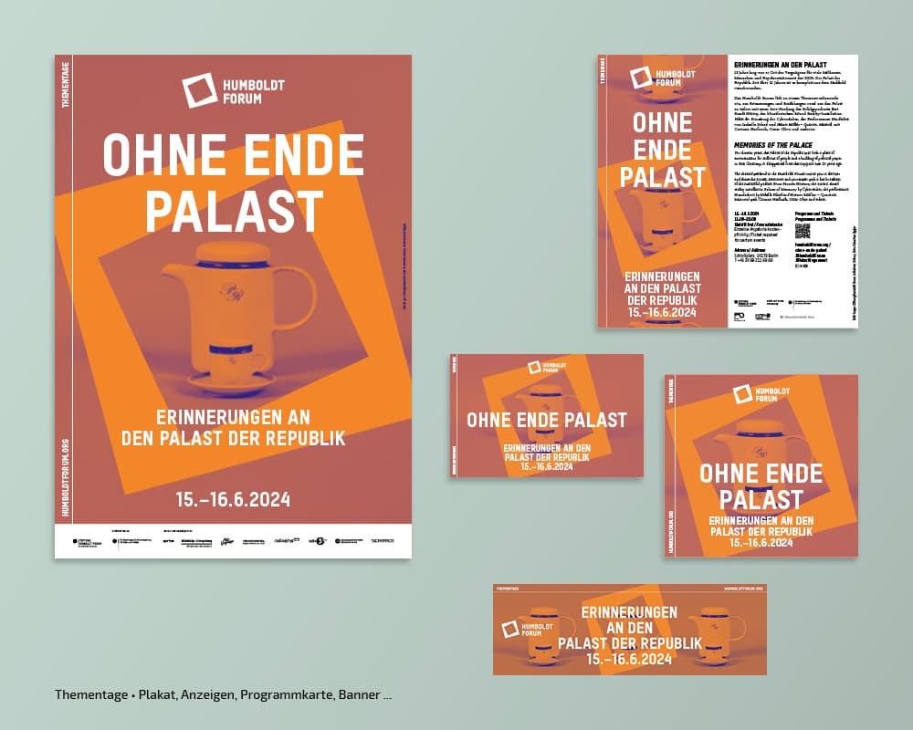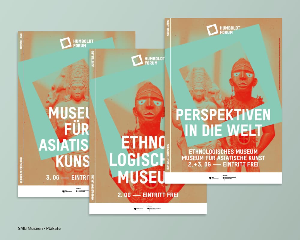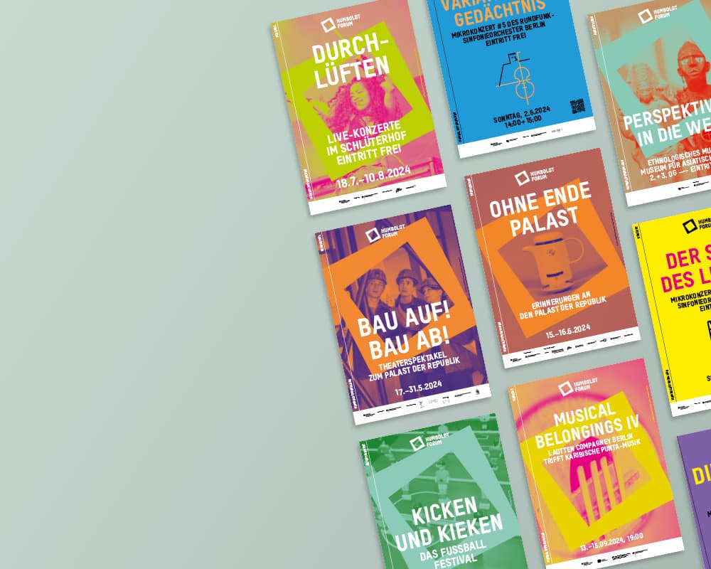 Seit der Eröfnung 2021 erstellt und adaptiert tsd zu diversen Kampagnen der Stiftung Humboldt Forum im Berliner Schloss Plakate, Broschüren, Anzeigen, Flyer, Banner, Programmzettel … Auch die Umsetzung verschiedener Keyvisuals, Nachhaltigkeitsberichte, Pressedossiers oder die Gestaltung von Icons gehören zum Aufgabengebiet.