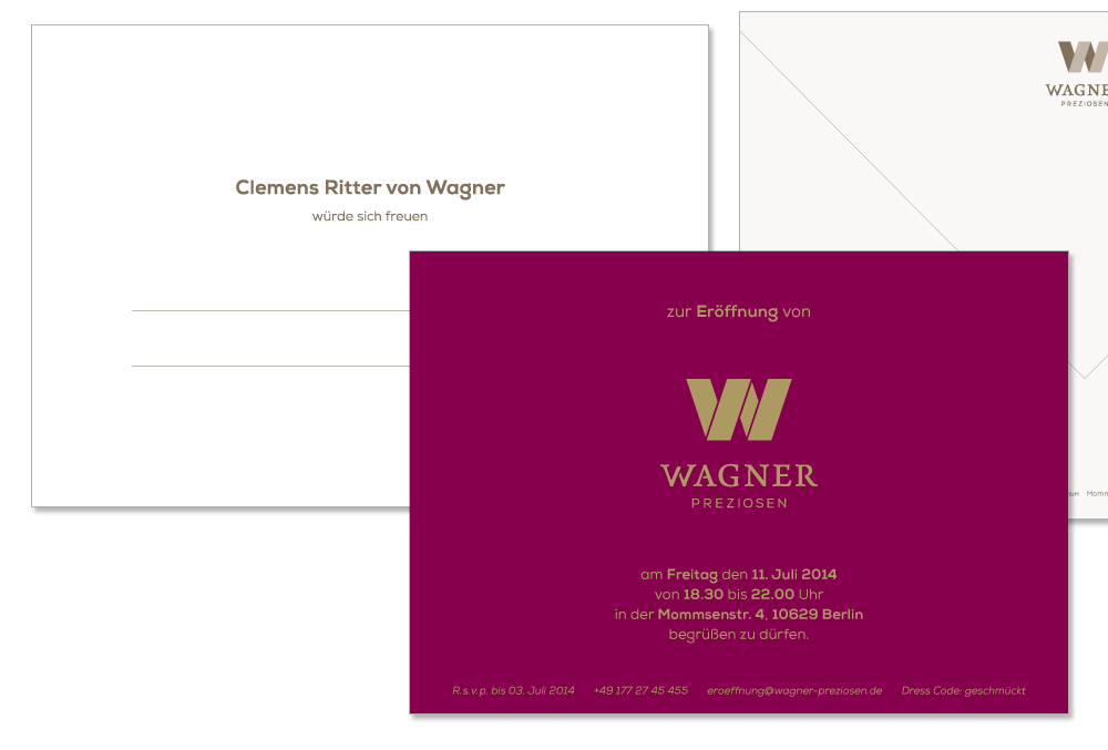 Die Einladungskarte zur Geschäftseröffnung: Ein purpurfarbenes Spezialpapier mit samtartiger Oberfläche, veredelt mit einer goldenen Heisfolienprägung. Präsentiert in einer Klappkarte mit Blindprägung und Reliefdruck. Verschickt in einem gebrandetem Kuvert mit Seidenpapiereinlage. Voila!