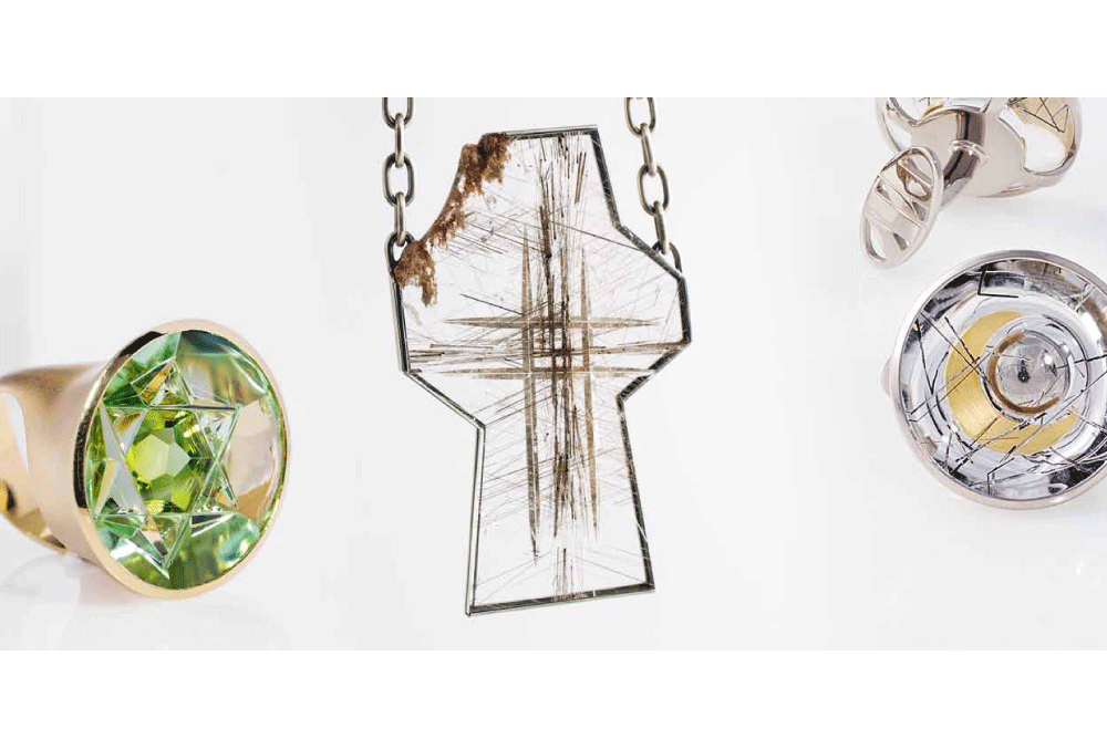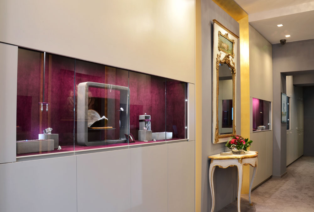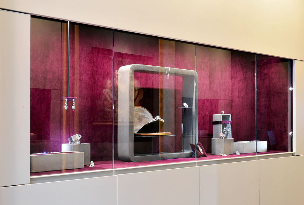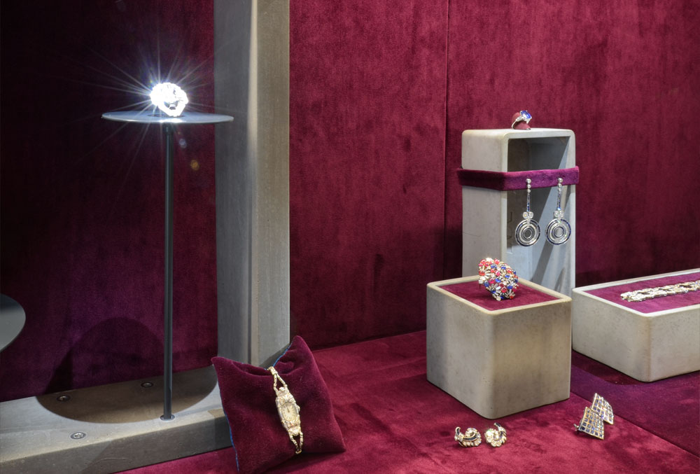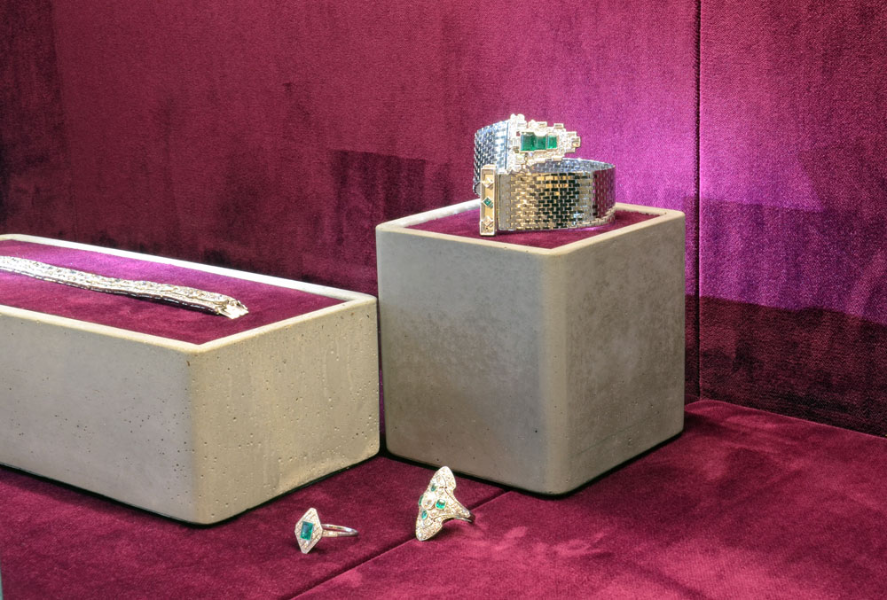 Die kostbaren Schmuckstücke erhielten unkonventionelle Verpackungen aus Beton, die gleichzeitig auch als Präsentationsfläche in den Vitrinen dienen.